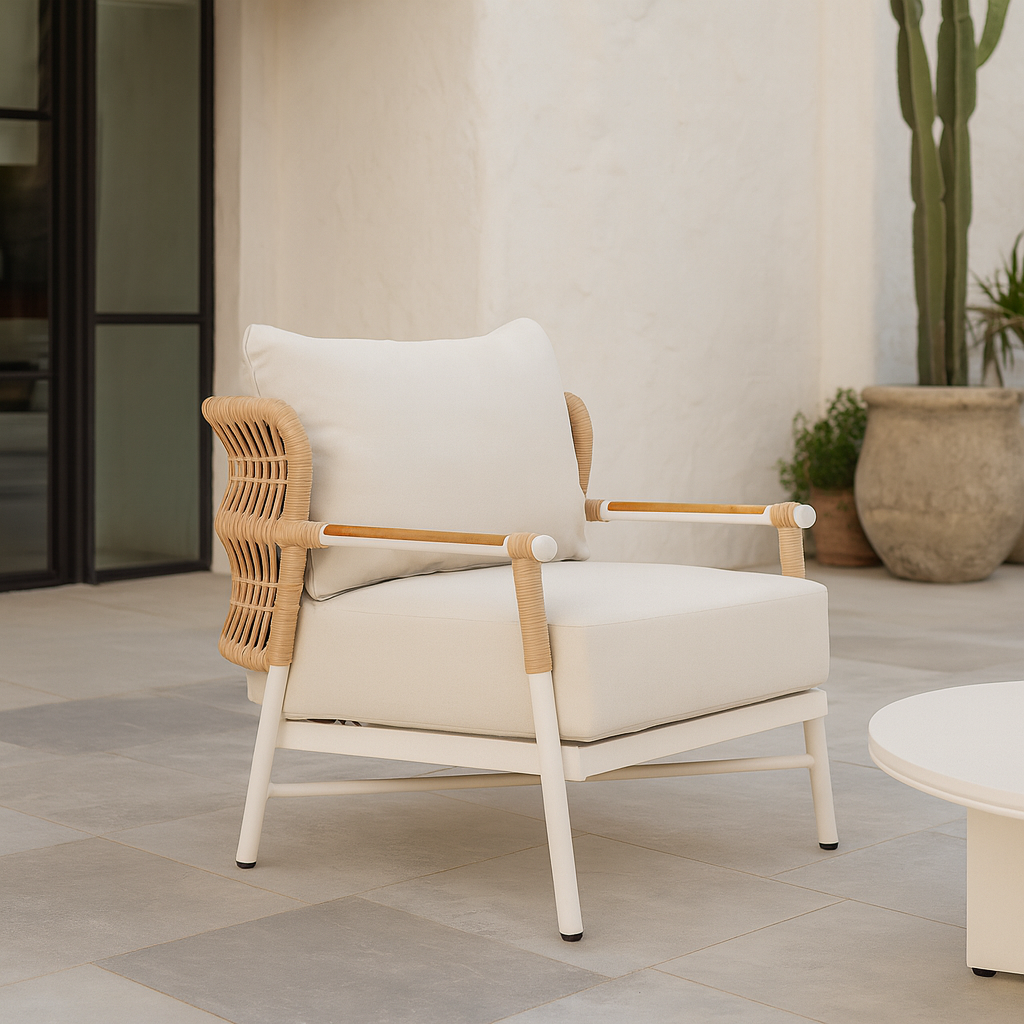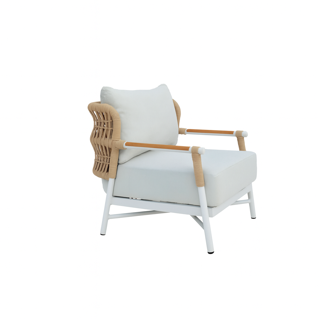 La Silla Bora Bora complementan el sofá, ofreciendo la misma elegancia y confort en un formato individual. Con una estructura ligera en aluminio, tejido en cuerda náutica color latte con protección UV y reposabrazos en teca, son ideales para disfrutar de la brisa en terrazas amplias. Su diseño amplio y ergonómico, junto con cojines impermeables de alta densidad, garantiza comodidad para largas conversaciones o momentos de descanso.