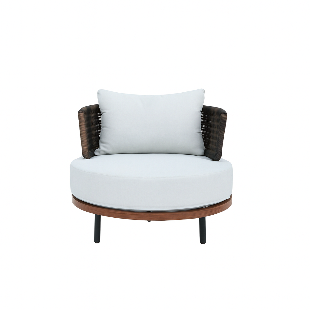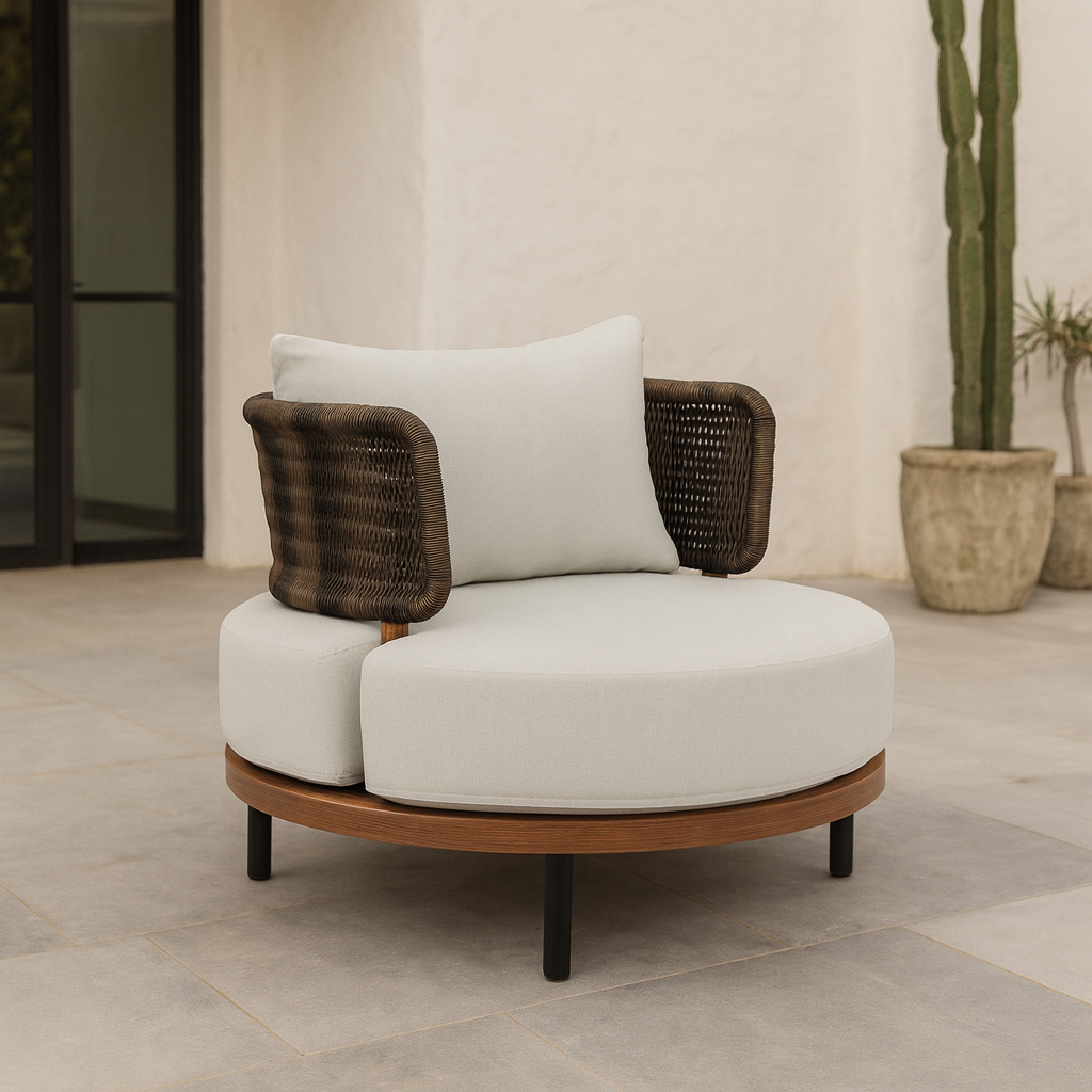 La Silla Maui es una poltrona diseñada para convertirse en la protagonista de balcones y terrazas pequeñas. Su silueta orgánica y sin ángulos refleja una de las tendencias más actuales en diseño de mobiliario, logrando una pieza llamativa que se roba todas las miradas. Fabricada en ratán sintético, con estructura de aluminio, detalles en teca y cojines impermeables, combina practicidad y estilo para espacios modernos y acogedores.