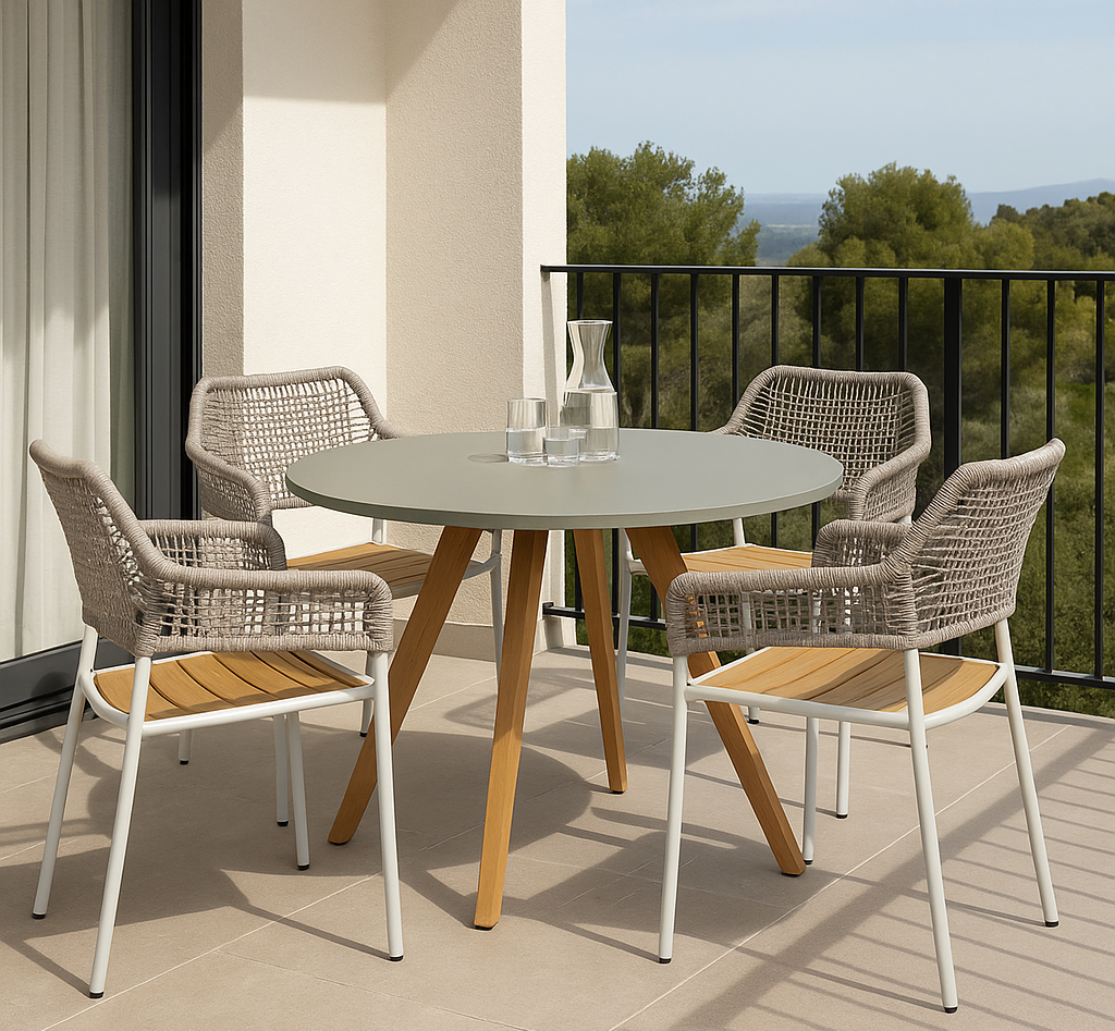 Gracias a la calidad de sus materiales, este producto está diseñado para todo tipo de clima, ofreciendo durabilidad y un acabado sofisticado que se adapta a diferentes ambientes: terrazas, jardines, balcones o comedores modernos.